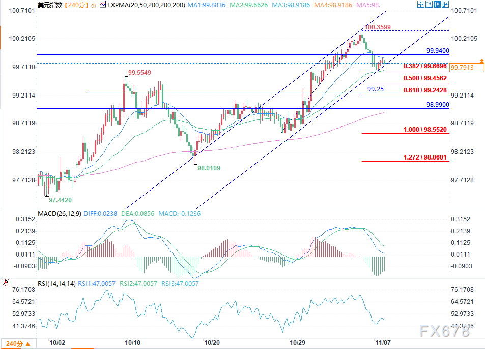 美元指数目前交投于99.87附近,在上升通道下轨及99.67的38.2%斐波那契回撤位获得支撑。该货币对10月大幅上涨后,近期从100.35回落,呈现短期盘整态势。